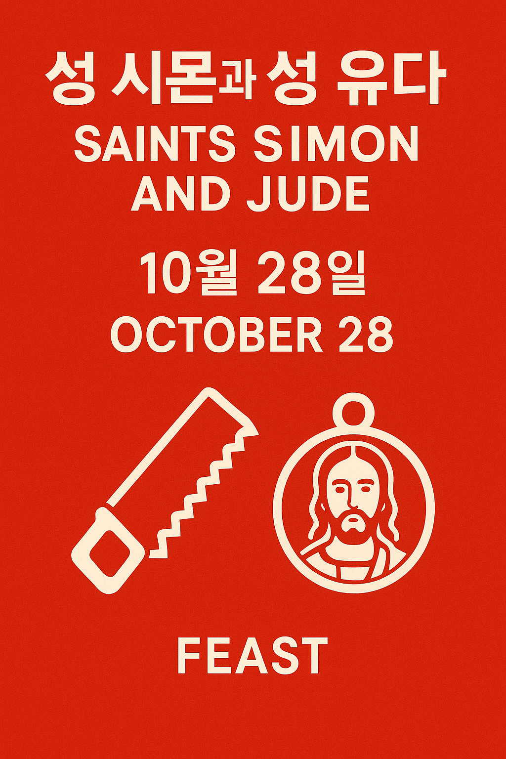 10월 28일은 성 시몬(열혈당원)과 유다(타대오) 사도의 사도단을 다시 세우는 날(축일)이에요. 전례 색은 빨강(사도·순교 전통)이에요. 사도는 복음의 직접 증인이자 교회의 기초이기 때문. 사도 축일은 신자 각자가 사도적 사명(증언·선교)을 다시 자각하는 날입니다.