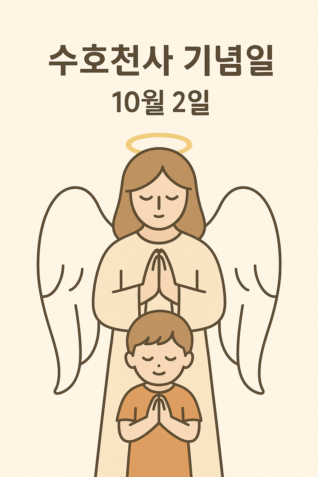 10월 2일은 하느님이 우리 각자에게 붙여 주신 수호천사를 기념하는 기념일이에요. 일의 삶에서 보호·인도·영감을 주시는 하느님의 배려를 기억한다는 의미에요. 전례 색은 흰색입니다.