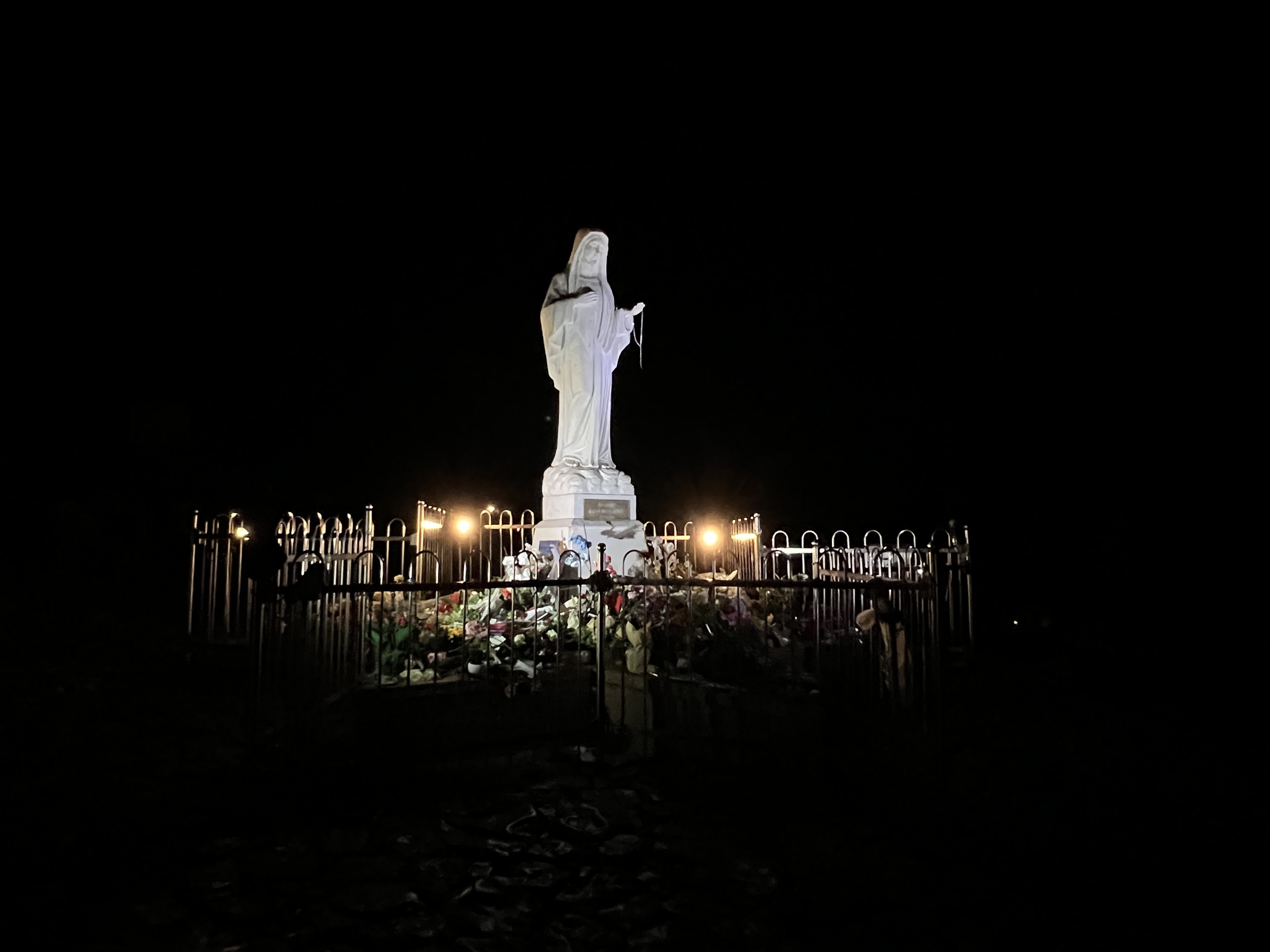 A. 정상부 성모상 주변과 사면 전망대 느낌의 바위 지대(광각 추천). (지형·혼잡 고려해 순례 방해 주의)