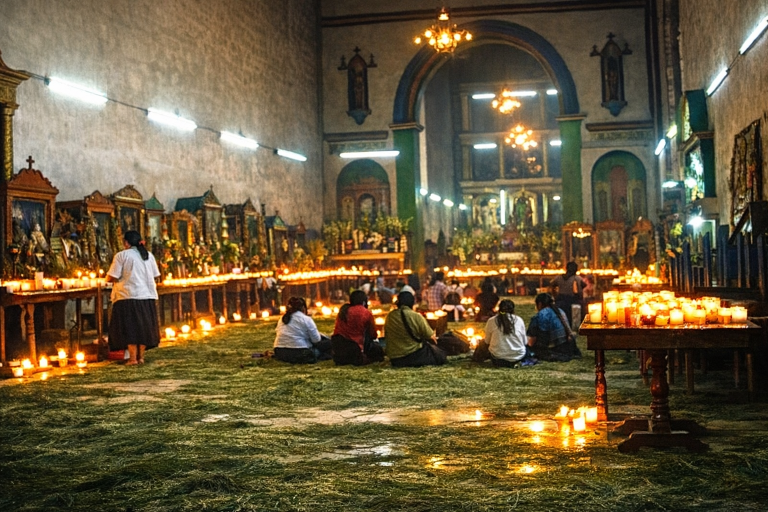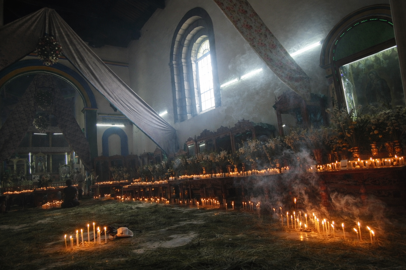 Candles covered every usable surface: the altar, the tables, ledges — anywhere a candle could stand, one did. The light wasn’t bright so much as low and breathing, and the smoke from burning copal resin drifted upwards, slowly filling the interior.