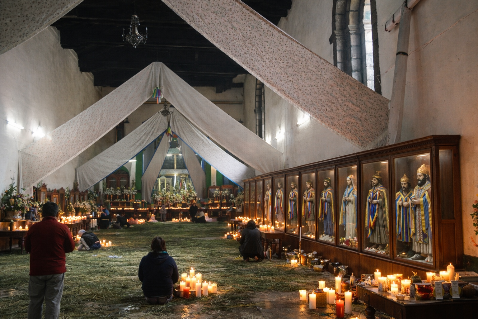 산 후안 차물라 성당 문을 들어서는 순간, 공기는 코팔(copal) 향과 수천 개 촛불이 내뿜는 열기와 연기로 저를 에워싸는 듯했고, 상상도 못했던 장면에 숨이 멎는 것 같았어요. 제가 익숙하게 보아온 가톨릭 성당과 달리 의자는 없고, 바닥에는 솔잎(소나무 잎)이 두텁게 깔려 있었어요. 촛칠 마야 공동체 사람들은 바닥에 앉아 기도하듯 낮게 웅얼거렸고, 자욱한 촛불 연기 속에서 벽을 따라 유리 진열장 안에 성인상과 성모상이 줄지어 서 있었어요. 이들은 무엇을 그토록 간절히 빌고 있는 것이었을까요?