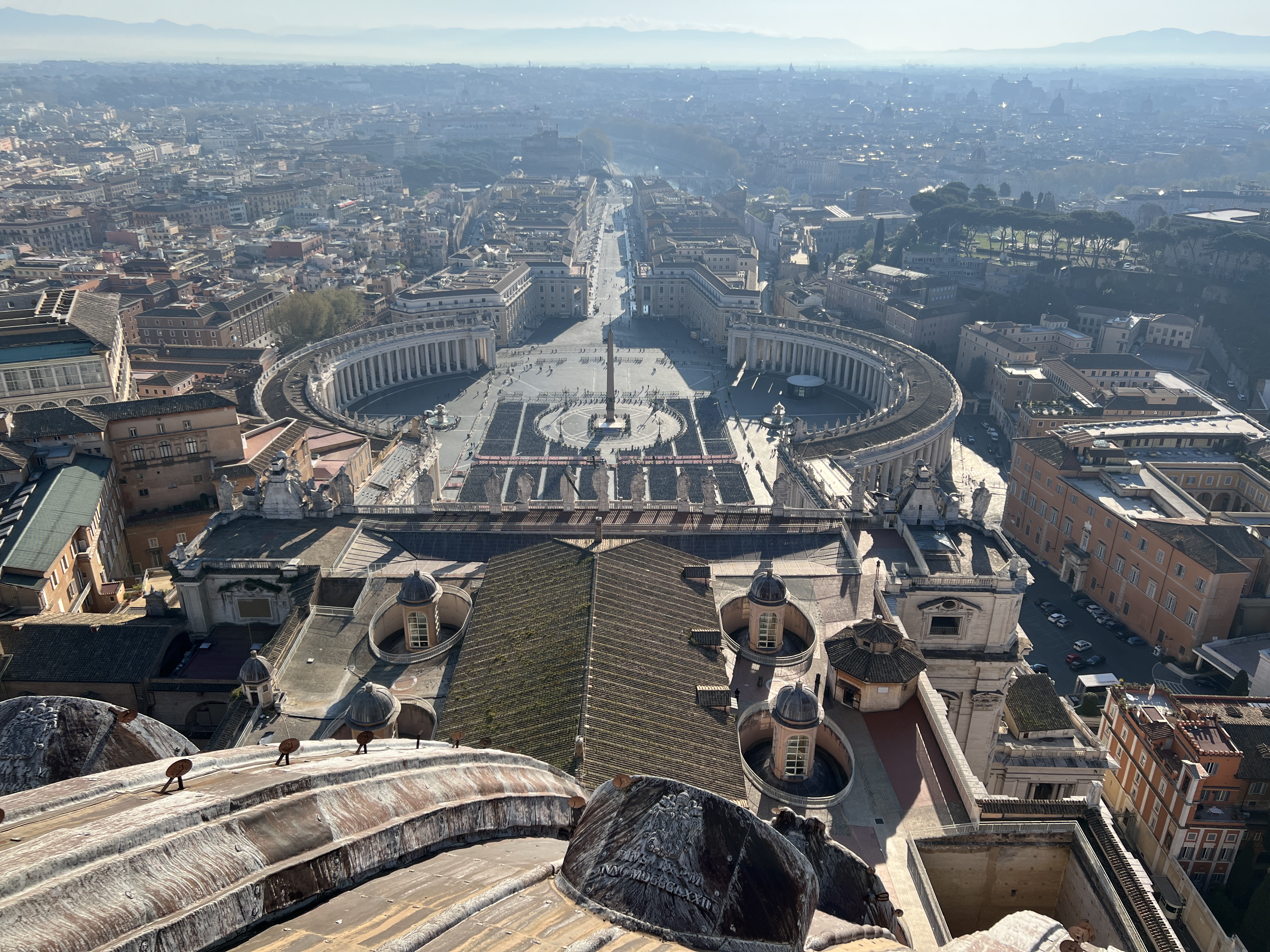 When I finally reached the top after that difficult final ascent, an astonishing view opened out before me. The first thing that caught my eye was St Peter’s Square spreading out below. Bernini’s great elliptical colonnades seemed to stretch out like open arms embracing the pilgrims, while the obelisk standing proudly at the centre gave the whole space a remarkable sense of order. From below, while walking through the square, I had not fully grasped its structure and harmony; from above, it all became beautifully clear at a glance.